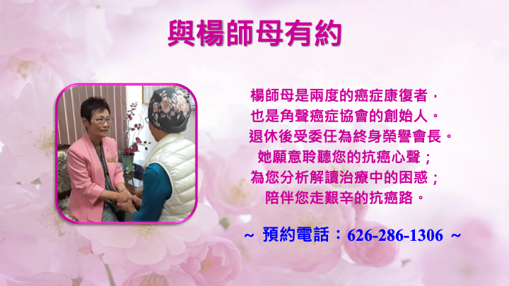 兩次乳癌康復者楊王惠真師母,為近期患者分析解讀治療中的困惑