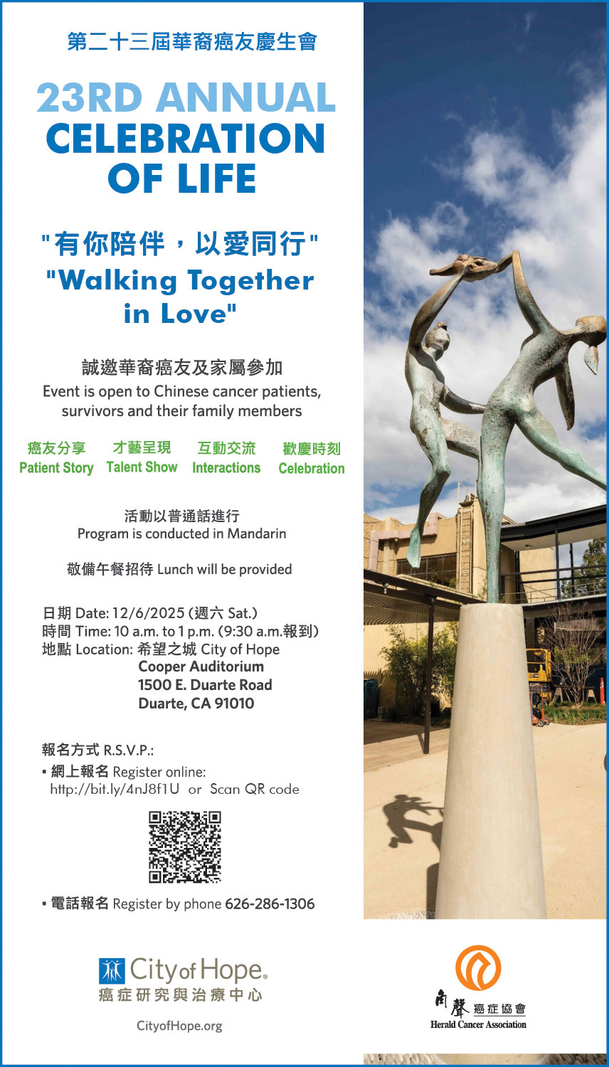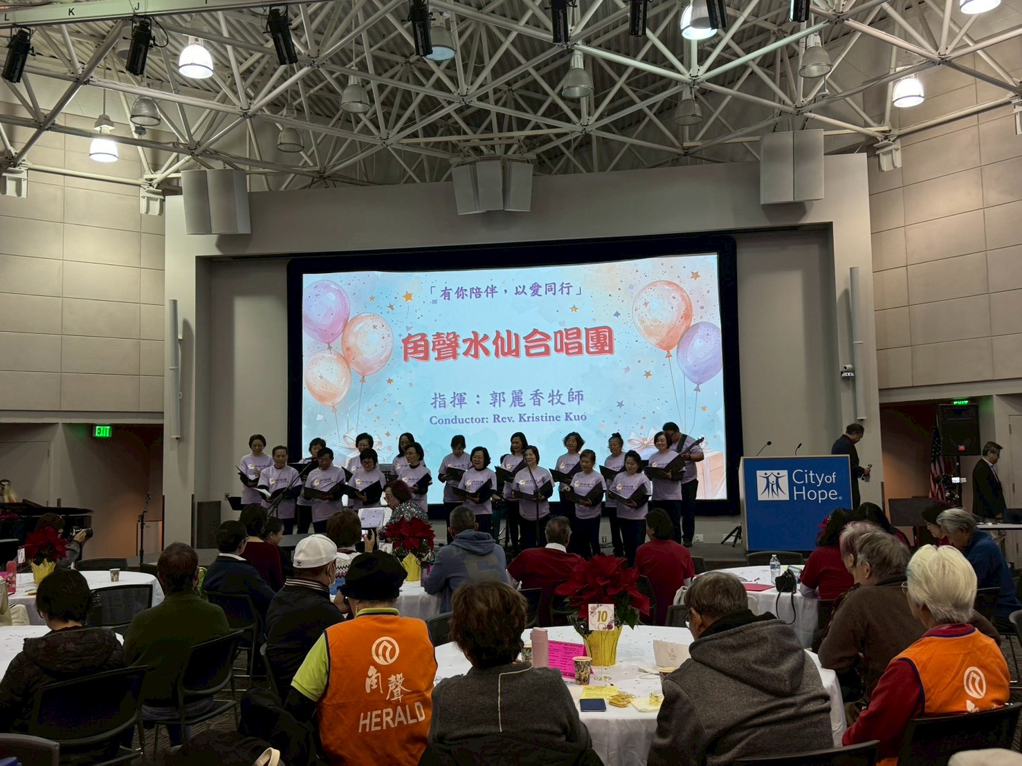 隨後登場的 水仙合唱團,以溫暖而動人的歌聲感動全場;而角聲橙縣負責同工也向來賓介紹 CARE 研究計畫,讓更多華裔朋友了解研究計畫的重要性與對癌症照護的深遠影響。